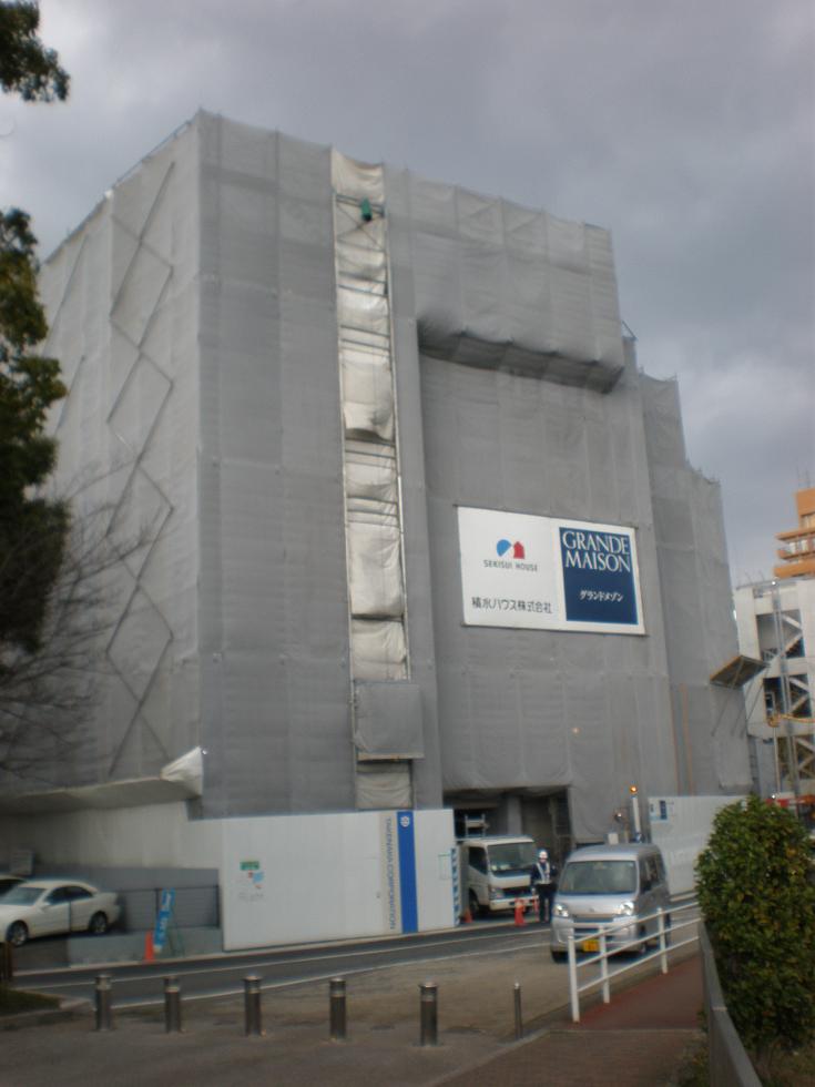 周辺への粉塵の対策ということで、猿鳶太助の取付しているスパンに 簡易のシートを張り、猿鳶太助自体もメッシュシートで囲いました。