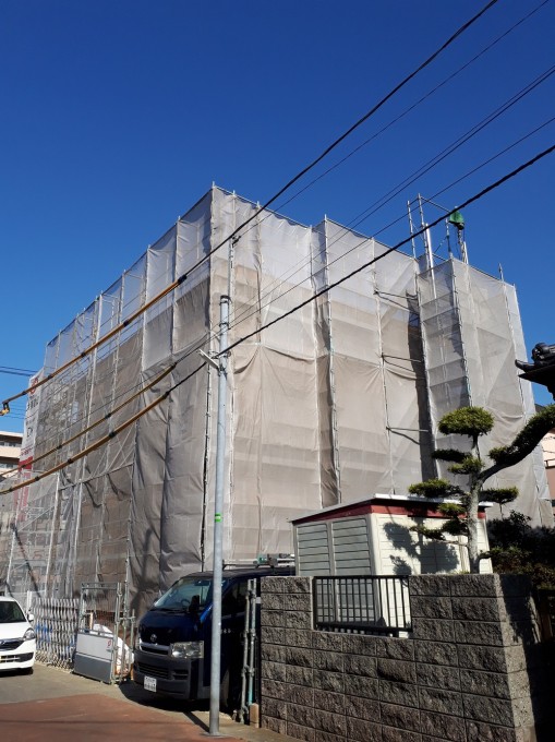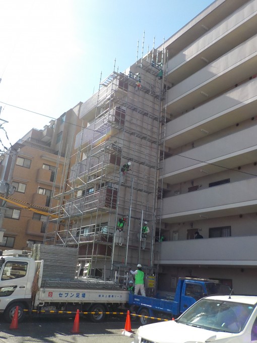 東京都多摩市の駅そばのマンション改修工事のくさび式足場組立にご利用いただきました